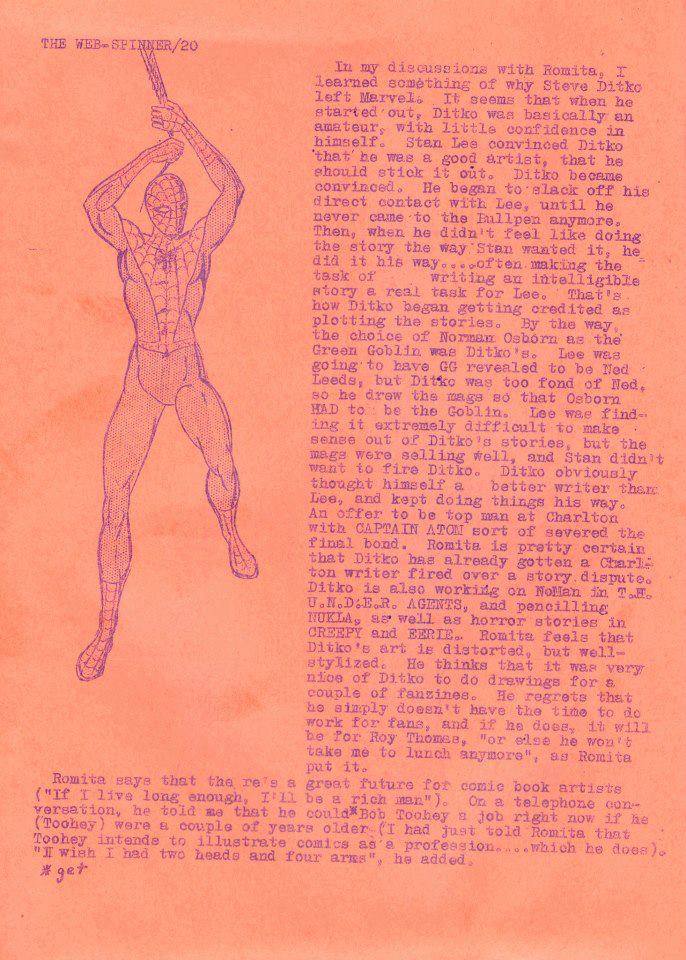 Shortly after Ditko’s departure, Lee’s disinformation campaign was taken to the fan press by John Romita. In the fanzine Web Spinner, 12 he told Bob Sheridan a number of reasons why Steve Ditko had not been the best employee. Some of the assertions were things that could only have been known by Lee, and they were false.